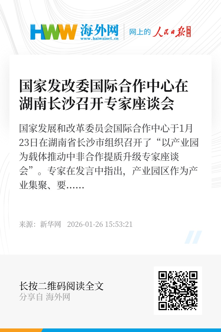 国家发展和改革委员会国际合作中心于1月23日在湖南省长沙市组织召开了“以产业园为载体推动中非合作提质升级专家座谈会”。
