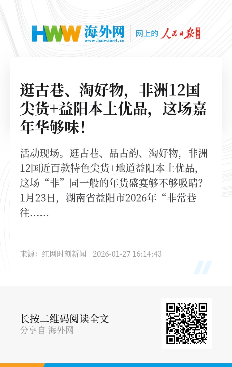 逛古巷、品古韵、淘好物,非洲12国近百款特色尖货+地道益阳本土优品,这场“非”同一般的年货盛宴够不够吸睛?1月23日,湖南省益阳市2026年“非常巷往”年货嘉年华在明清古巷火热启幕,吸引市民游客沉浸式体验跨越山海的好物碰撞,品味古巷里的烟火气息。
