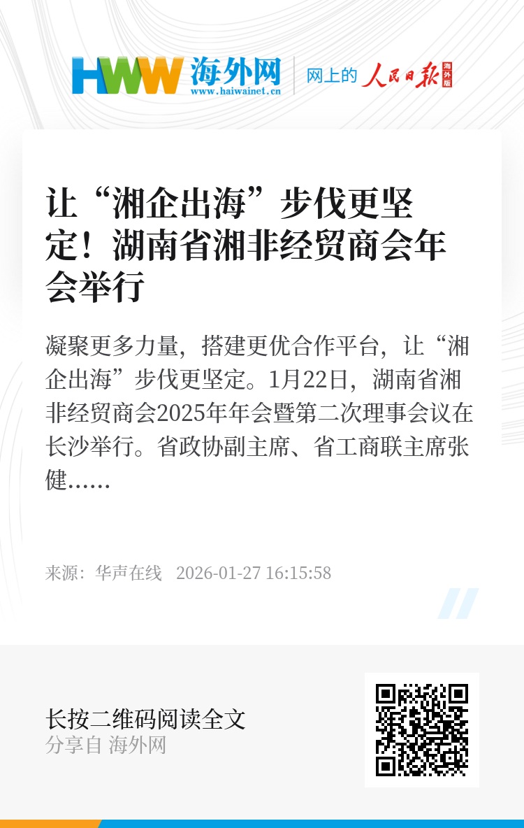 凝聚更多力量,搭建更优合作平台,让“湘企出海”步伐更坚定。1月22日,湖南省湘非经贸商会2025年年会暨第二次理事会议在长沙举行。省政协副主席、省工商联主席张健出席。