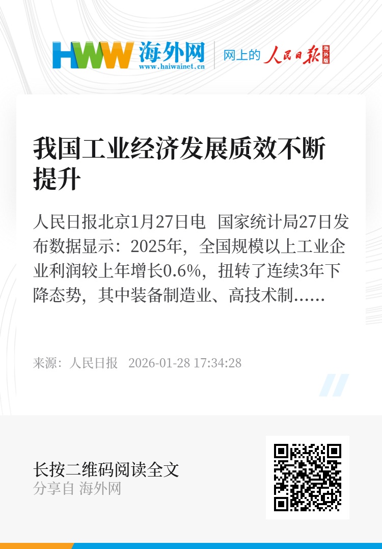 人民日报北京1月27日电 国家统计局27日发布数据显示:2025年,全国规模以上工业企业利润较上年增长0.6%,扭转了连续3年下降态势,其中装备制造业、高技术制造业等新动能支撑作用明显,传统产业利润结构持续优化,工业经济发展质效不断提升。