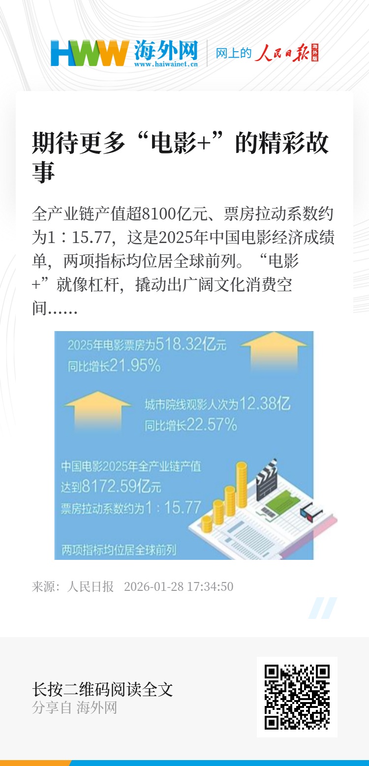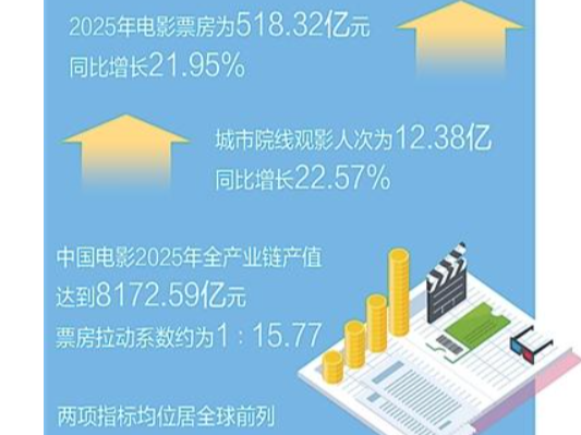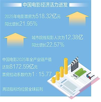 全产业链产值超8100亿元、票房拉动系数约为1∶15.77,这是2025年中国电影经济成绩单,两项指标均位居全球前列。“电影+”就像杠杆,撬动出广阔文化消费空间,成为观察中国超大规模市场的一个窗口。