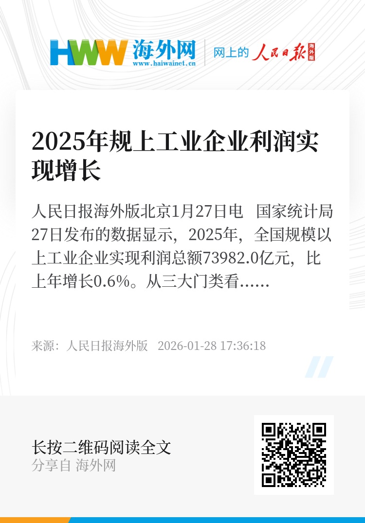 人民日报海外版北京1月27日电 国家统计局27日发布的数据显示,2025年,全国规模以上工业企业实现利润总额73982.0亿元,比上年增长0.6%。从三大门类看,制造业增长5.0%,增速较2024年大幅回升8.9个百分点;电力、热力、燃气及水生产和供应业增长9.4%;采矿业下降26.2%。