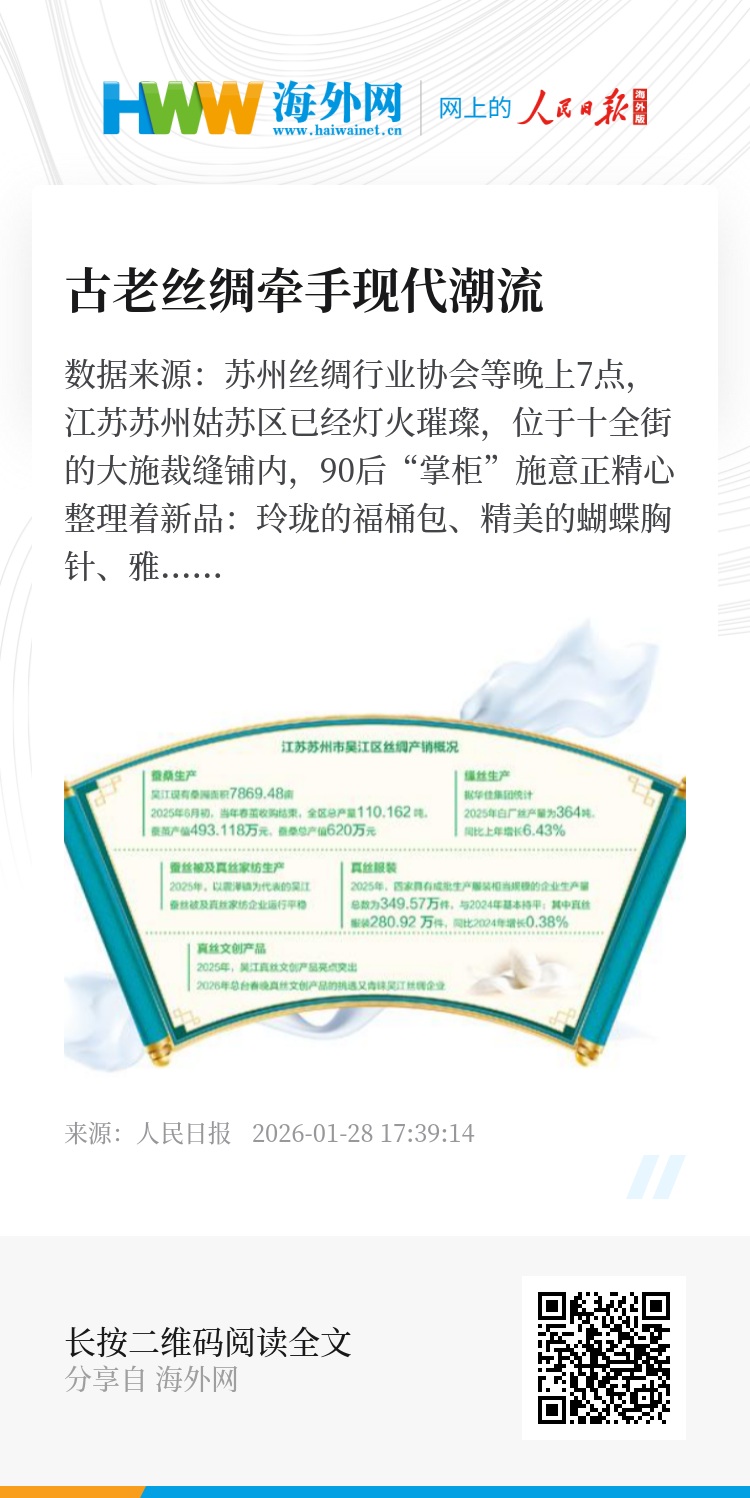 当丝绸融入茶饮、民宿、研学……它已从单一产品进化为一种生活哲学。在苏州,古老的蚕桑智慧,不再是尘封的遗产,而是升腾着烟火气、焕发着新活力的日常经济。在太湖之畔的浓浓市井气中,一幅生机勃勃的现代版“耕织图”正徐徐展开。(记者 王伟健)