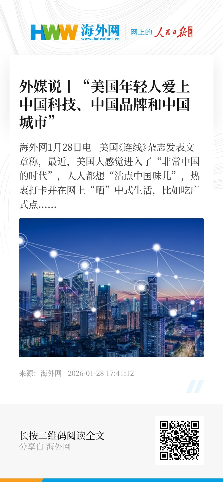 文章称,许多美国人,尤其是年轻一代,爱上了中国科技、中国品牌和中国城市。他们正在消费更多中国制造的产品,包括手机、笔记本电脑、扫地机器人、潮流玩具、太阳能电池板、电动汽车等。美国一名网红在视频中说:“我突然发现,你们很多人还没有意识到自己的‘中国味儿’,让我来提醒你们:你现在刷的是不是中国开发的应用程序?用的是不是中国制造的手机?穿的是不是中国制造的衣服?收集的玩偶是不是来自中国?”