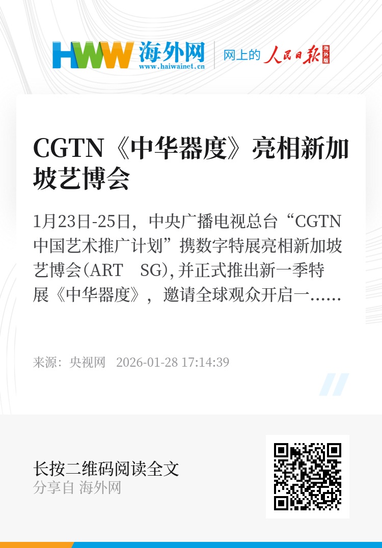 1月23日-25日,中央广播电视总台“CGTN中国艺术推广计划”携数字特展亮相新加坡艺博会(ART SG),并正式推出新一季特展《中华器度》,邀请全球观众开启一场穿越千年的沉浸式中华美学之旅。