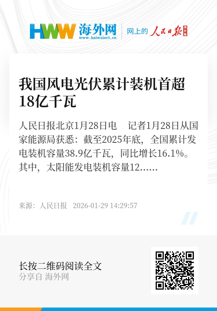 人民日报北京1月28日电 记者1月28日从国家能源局获悉:截至2025年底,全国累计发电装机容量38.9亿千瓦,同比增长16.1%。其中,太阳能发电装机容量12.0亿千瓦,同比增长35.4%;风电装机容量6.4亿千瓦,同比增长22.9%。