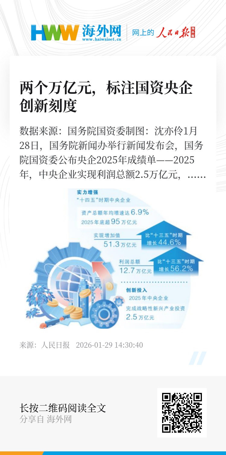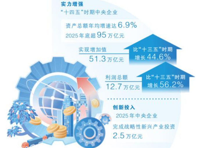 2025年,中央企业实现利润总额2.5万亿元,完成固定资产投资5.1万亿元,上交税费2.5万亿元。截至2025年底,中央企业资产总额突破95万亿元。