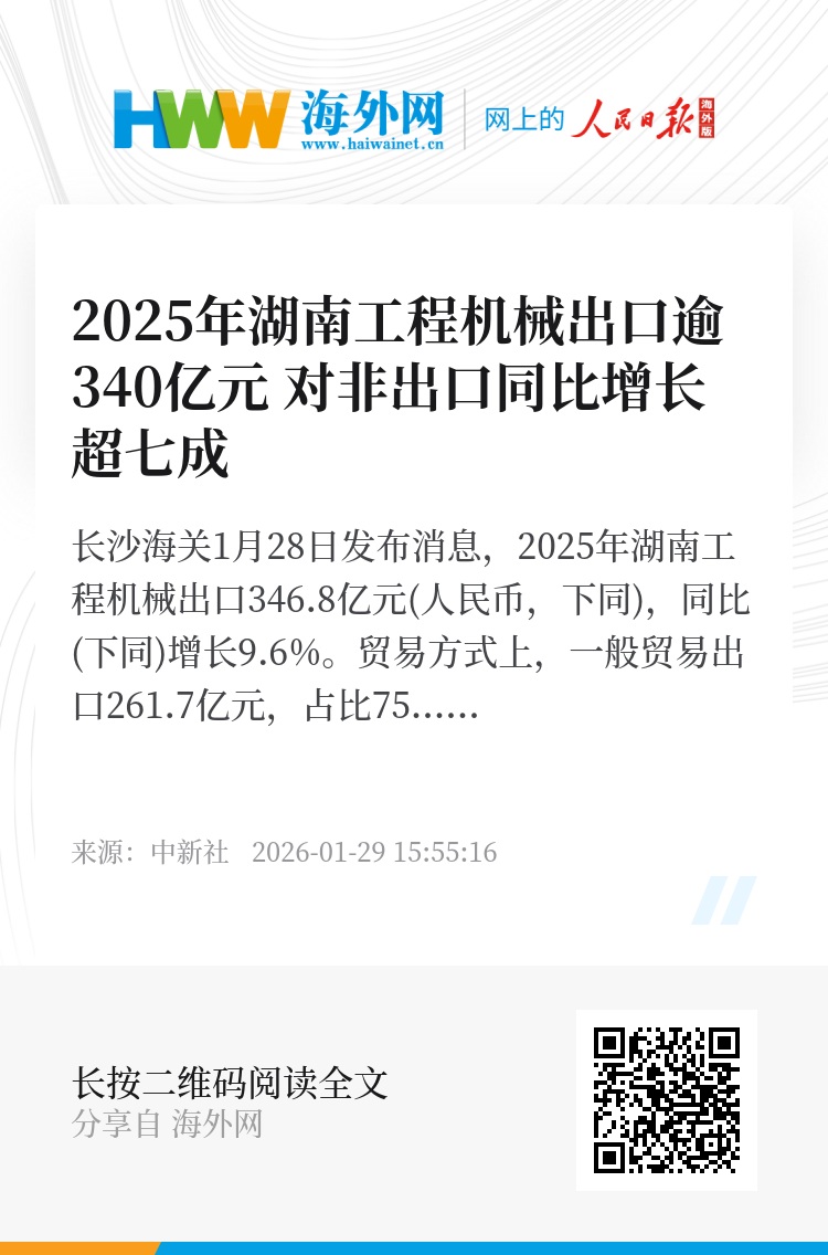 长沙海关1月28日发布消息,2025年湖南工程机械出口346.8亿元(人民币,下同),同比(下同)增长9.6%。
