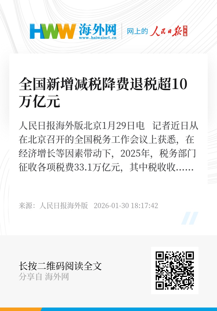 人民日报海外版北京1月29日电 记者近日从在北京召开的全国税务工作会议上获悉,在经济增长等因素带动下,2025年,税务部门征收各项税费33.1万亿元,其中税收收入17.8万亿元,税费收入预算目标圆满完成;落实支持科技创新和制造业发展的主要优惠政策减税降费退税超2.8万亿元。“十四五”时期,税务部门累计征收税费超156万亿元,约占全口径财政收入的80%;累计新增减税降费退税超10万亿元。
