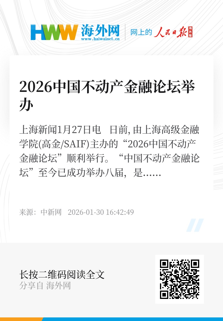 中新网上海新闻1月27日电 日前,由上海高级金融学院(高金/SAIF)主办的“2026中国不动产金融论坛”顺利举行。“中国不动产金融论坛”至今已成功举办八届,是国内顶级的不动产行业和金融行业进行思维碰撞、深度互动与合作交流的开放平台之一。本届论坛以“贯通与破局”为主题,汇聚专家与业界领袖,深入探讨在不动产市场发展格局调整下,如何通过贯通资产、资本与资金的循环链路,破局传统发展模式的约束,构建不动产金融新生态。