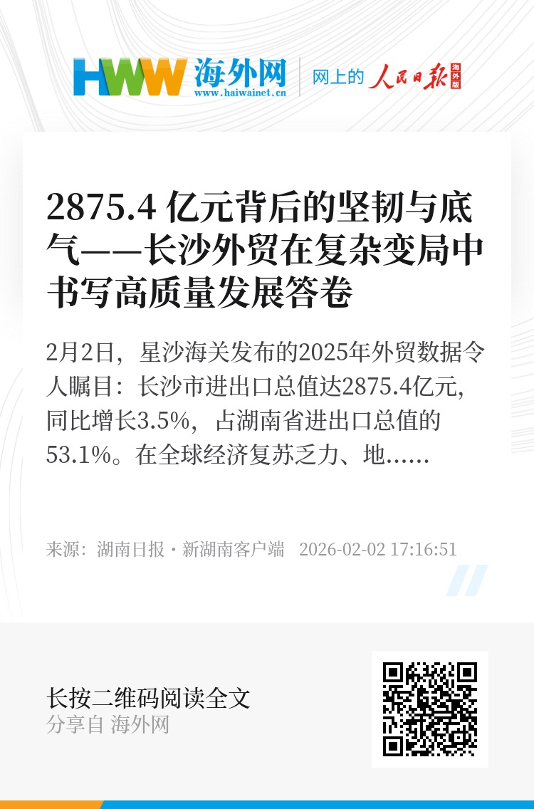 从政策赋能到创新驱动,从主体培育到平台升级,2875.4亿元的外贸成绩背后,是长沙外贸的坚韧与智慧。站在新的发展起点,长沙将继续深耕开放赛道,持续释放政策红利,积极推动优势产能出海,加力壮大开放型经济。(湖南日报•新湖南客户端记者 李治 通讯员 唐铭宏)