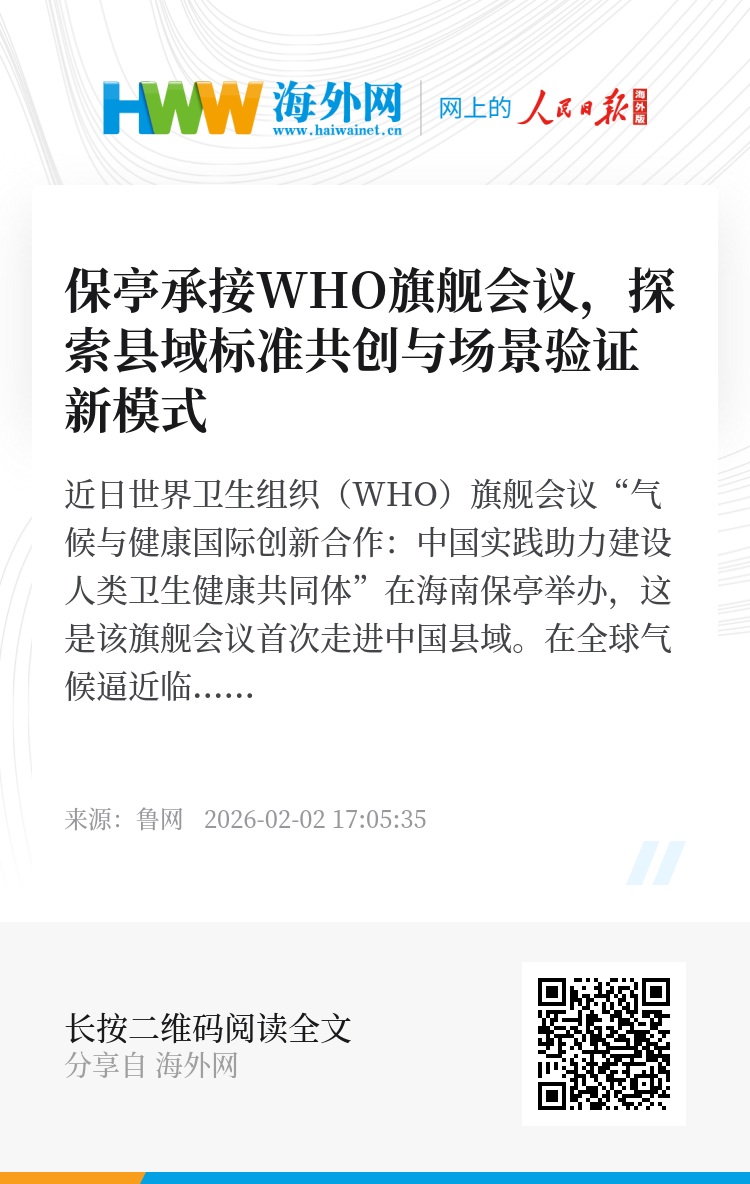 近日世界卫生组织(WHO)旗舰会议“气候与健康国际创新合作:中国实践助力建设人类卫生健康共同体”在海南保亭举办,这是该旗舰会议首次走进中国县域。在全球气候逼近临界点的背景下,保亭成为全球气候健康治理从理论倡导转向县域实践的关键试验场。