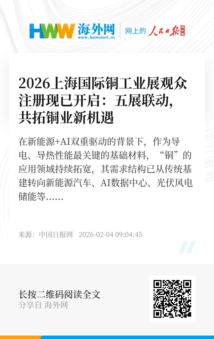 从五展联动的规模效应、前沿技术的高端活动、精准高效的商贸匹配到全球资源的整合链接,上海国际铜工业展览会将为全球铜工业及相关应用领域专业人士提供年度重要的交流契机。为方便业界同仁提前规划行程并充分获取参会价值,观众注册报名系统现已全面上线:即日起至 2026年6月30日,通过展会官网或官方微信公众号完成登记注册的观众,可免费获取参观权益(原门票价值100元)。 此后登记或现场购票,均需按标准缴费。