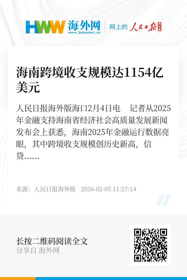 人民日报海外版海口2月4日电 记者从2025年金融支持海南省经济社会高质量发展新闻发布会上获悉,海南2025年金融运行数据亮眼,其中跨境收支规模创历史新高,信贷增速居全国前列。
