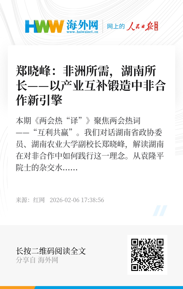 本期《两会热“译”》聚焦两会热词——“互利共赢”。我们对话湖南省政协委员、湖南农业大学副校长郑晓峰,解读湖南在对非合作中如何践行这一理念。