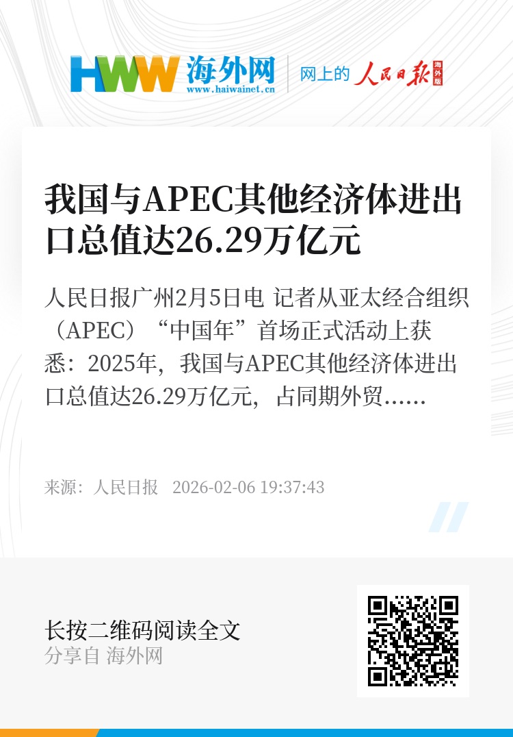 人民日报广州2月5日电 记者从亚太经合组织(APEC)“中国年”首场正式活动上获悉:2025年,我国与APEC其他经济体进出口总值达26.29万亿元,占同期外贸总值的57.82%。我国在区域供应链中实现了从“加工制造”向“研发+制造+服务”的跃升,对APEC经济体进出口双向发力,其中高新技术产品出口4.63万亿元,同比增长8.1%,能源、农产品、半导体设备、精密仪器等关键领域进口也保持较快增长。新业态新模式蓬勃发展,跨境电商快速增长,以数据流动、电子单证为代表的数字贸易,以及新能源、低碳产品等绿色贸易,成为外贸增长新亮点。