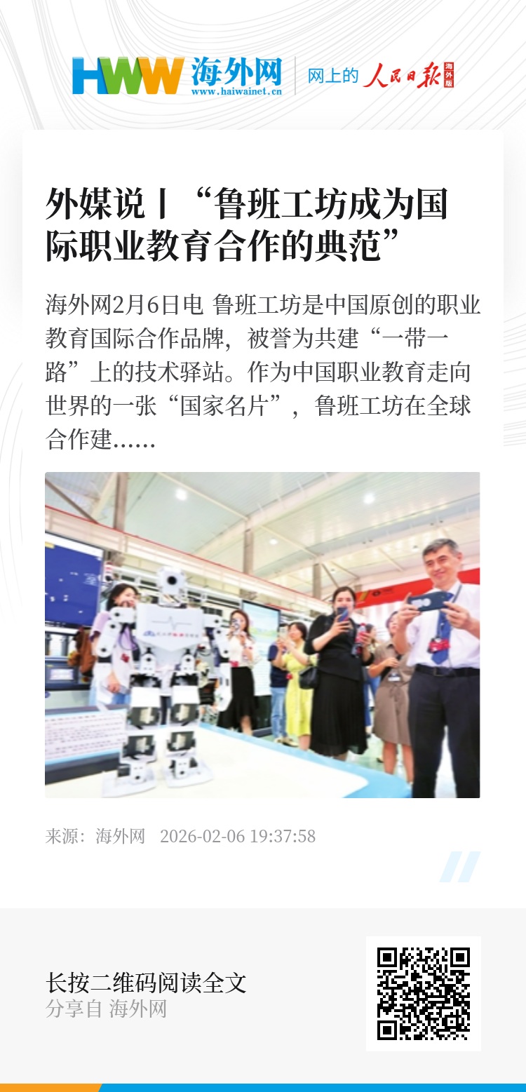 海外网2月6日电 鲁班工坊是中国原创的职业教育国际合作品牌,被誉为共建“一带一路”上的技术驿站。作为中国职业教育走向世界的一张“国家名片”,鲁班工坊在全球合作建成30多所,引发外媒广泛关注。外媒普遍认为,鲁班工坊已成为全球职业教育合作的典范,为当地经济社会发展注入新的活力。