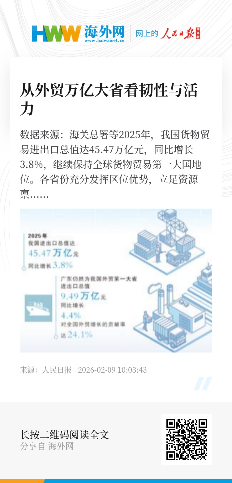 2025年,我国货物贸易进出口总值达45.47万亿元,同比增长3.8%,继续保持全球货物贸易第一大国地位。各省份充分发挥区位优势,立足资源禀赋,积极为我国进出口稳步发展作出贡献。外贸“成绩单”,彰显出中国经济的韧性与活力。