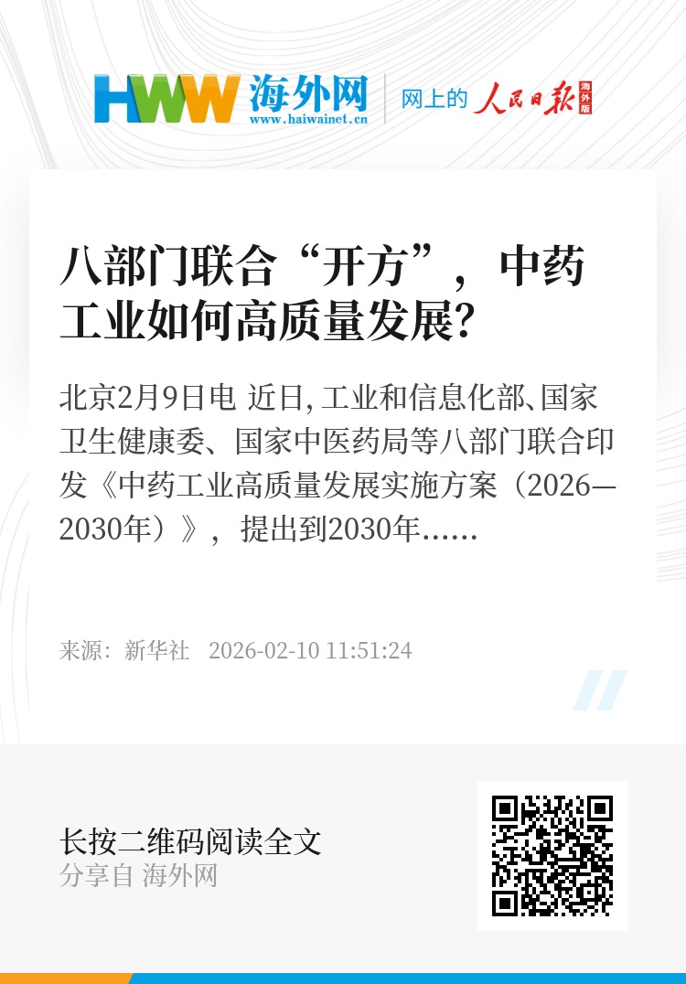 新华社北京2月9日电 近日,工业和信息化部、国家卫生健康委、国家中医药局等八部门联合印发《中药工业高质量发展实施方案(2026—2030年)》,提出到2030年,中药工业全产业链协同发展体系初步形成。