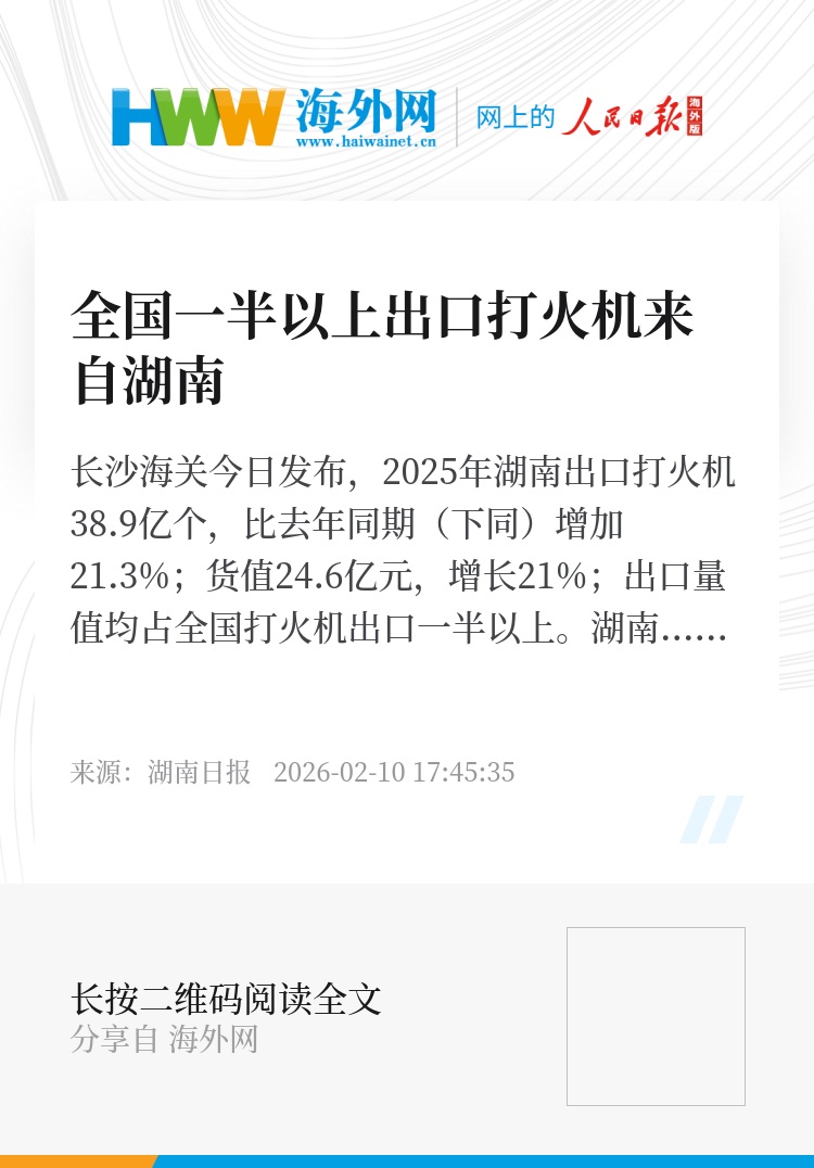 长沙海关今日发布,2025年湖南出口打火机38.9亿个,比去年同期(下同)增加21.3%;货值24.6亿元,增长21%;出口量值均占全国打火机出口一半以上。