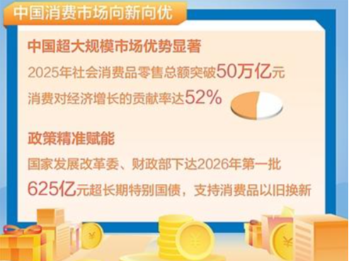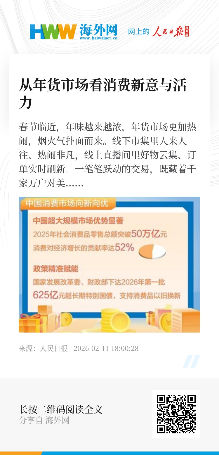2026年,消费市场的支撑条件坚实:政策层面,消费品以旧换新等举措持续发力,“购在中国”系列活动强化政策协同,为促进消费保驾护航;市场层面,健康、智能、个性化消费趋势进一步凸显,国潮文化与消费场景深度融合,新的增长点不断涌现。我国超大规模市场优势显著,2025年社会消费品零售总额突破50万亿元,消费对经济增长的贡献率达52%,巨大的消费潜力仍有待进一步释放。精准捕捉年货市场传递的消费新动向,紧跟消费升级步伐,持续优化供给体系,更加充分释放超大规模市场潜力,就能为高质量发展提供强劲动力,推动民生改善和经济发展有效对接、相得益彰。(王 珂)
