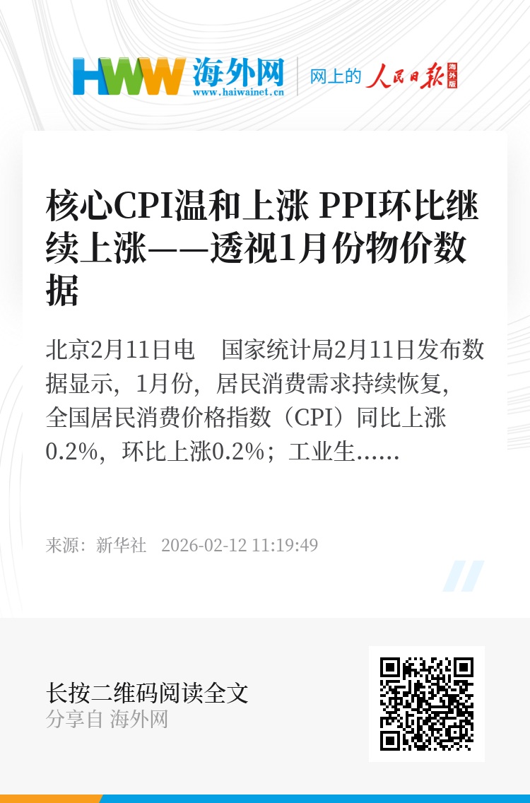 新华社北京2月11日电 国家统计局2月11日发布数据显示,1月份,居民消费需求持续恢复,全国居民消费价格指数(CPI)同比上涨0.2%,环比上涨0.2%;工业生产者出厂价格指数(PPI)同比下降1.4%,降幅比上月收窄0.5个百分点;环比上涨0.4%,涨幅比上月扩大0.2个百分点。