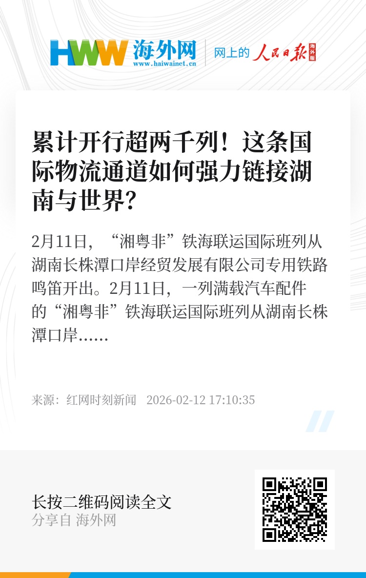 一条高效、便捷、经济的国际物流通道,正持续为湖南构建更高水平对外开放新格局,注入澎湃的运力支撑。两千列,是一个里程碑,更是一个新起点。潮涌湘粤,联通非欧,湖南“出海”的故事,正在写下更精彩的篇章。(红网时刻新闻记者 任洁 通讯员 何奇 蒋跃 孟祥琳)