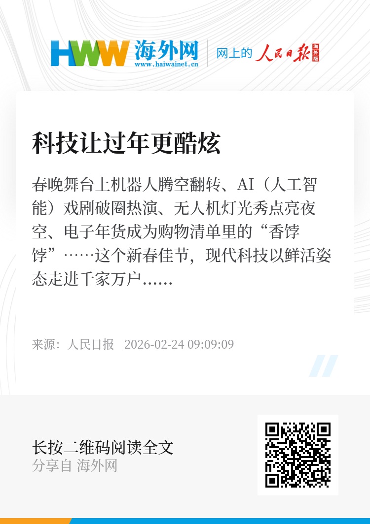 春晚舞台上机器人腾空翻转、AI(人工智能)戏剧破圈热演、无人机灯光秀点亮夜空、电子年货成为购物清单里的“香饽饽”……这个新春佳节,现代科技以鲜活姿态走进千家万户,传统年味里有了更多新质生产力的炫酷范儿。