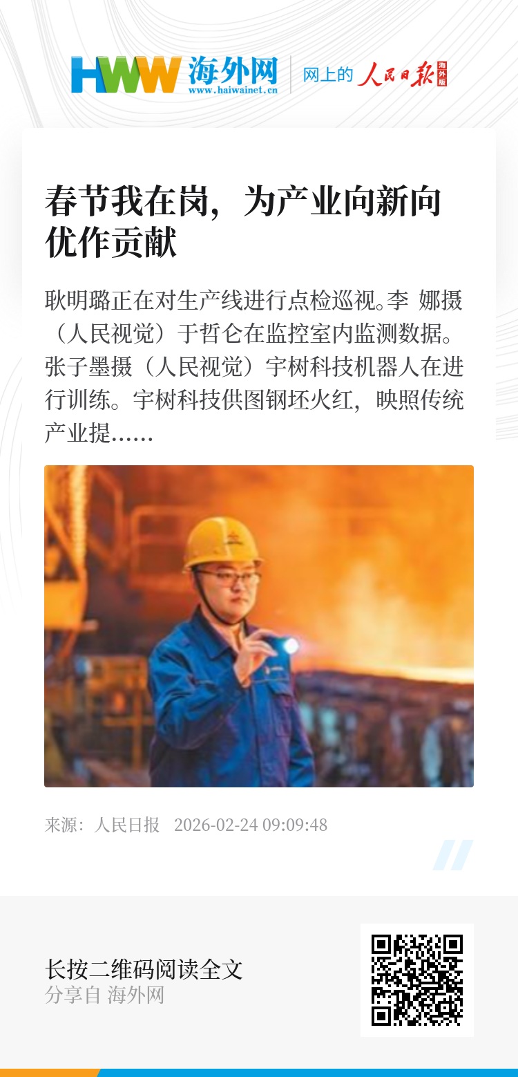 钢坯火红,映照传统产业提质升级的进程;绿电聚合,显现新兴产业成长壮大的澎湃动能;人形机器人身姿灵动,是未来产业加速培育的生动写照……“十五五”开局之年,春天里,让我们透过3个镜头,观察现代化产业体系建设的稳健步伐,感受劳动者的奋斗热情。