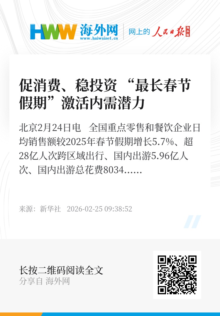 “坚持内需主导,建设强大国内市场”被中央经济工作会议列为2026年经济工作重点任务之首。春节假期的新气象,是经济活力的直观体现,也展示出内需潜力正有效释放。(记者 周圆 胡林果)