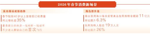 “新”年味儿,体现在消费新场景的鲜活感。国潮范更浓,上海豫园灯会融入潮流IP,陕西、河南推出非遗市集专项活动,受到游客欢迎。科技感更强,浙江年货大集上,智能眼镜、翻译耳机等新产品走俏。冰雪游、海岛游等多点升温,春运首周海口海关监管离岛免税购物金额超11亿元,免税购物人数超19万人次,环比分别提升6.3%、26%。95亿人次的流动,见证高品质、多元化的消费新趋势,让年味儿更有烟火气、更具感染力。