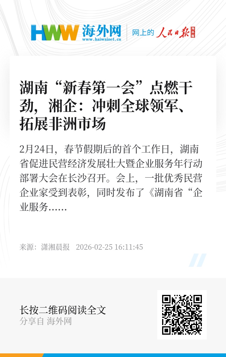 新的一年,王薪程把目光投向了更广阔的市场:“今年我们要重点深耕非洲,开拓刚果(金)、津巴布韦、赞比亚等新兴市场。我的使命,就是把‘湖南造’推向更智能、更国际化的舞台。”