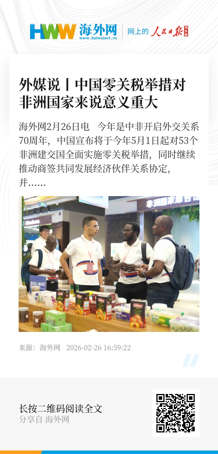 海外网2月26日电 今年是中非开启外交关系70周年,中国宣布将于今年5月1日起对53个非洲建交国全面实施零关税举措,同时继续推动商签共同发展经济伙伴关系协定,并通过升级“绿色通道”等进一步扩大非洲输华产品准入。这一系列开放举措引发外媒热议。“这种开放既及时又影响深远,对非洲国家来说意义重大,极大提振了非洲国家的信心,为中非经济合作注入新动力。”外媒表示。