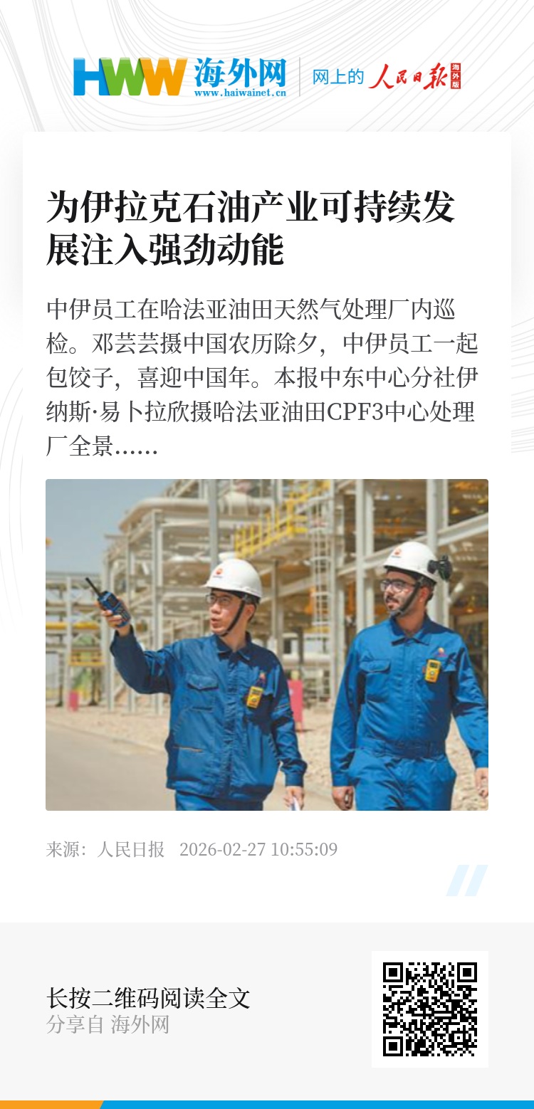 从教育卫生到民生保障,再到道路桥梁建设,15年来,哈法亚公司启动了一系列惠及民生的基础设施建设项目,累计完成公益项目数十个,惠及居民约10万人次,2025年获得伊拉克米桑省政府颁发的社区杰出贡献奖。伊拉克中国友好协会主席海德尔·鲁拜伊表示:“伊中能源合作是高质量共建‘一带一路’框架下具有战略意义的合作,中方项目对伊拉克经济发展和民生改善作出了显著贡献。”(记者 张志文)