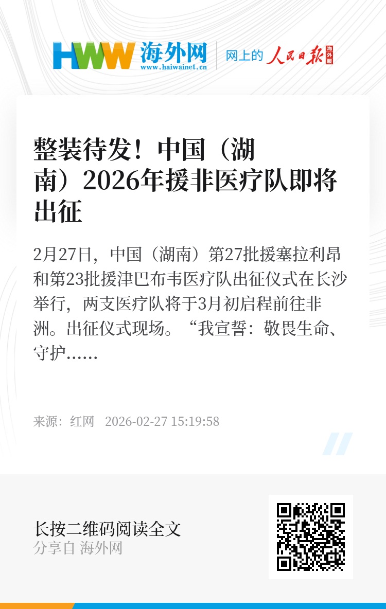 此次两支援外医疗队将继续弘扬中国援外医疗精神,进一步落实中非“卫生健康伙伴行动”,探索实施“新时代神农尝百草工程”,提升受援国公共卫生能力,多维度拓展湘非医疗卫生合作领域,为增进中非人民健康福祉、推动构建人类卫生健康共同体作出新的更大贡献。(记者 戴丹 通讯员 黄超琼 樊文达)