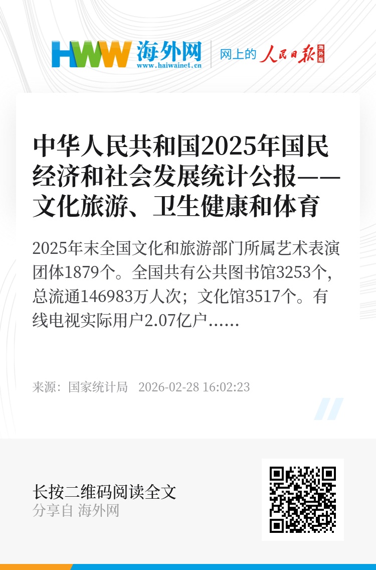 2025年末全国文化和旅游部门所属艺术表演团体1879个。全国共有公共图书馆3253个,总流通146983万人次;文化馆3517个。有线电视实际用户2.07亿户,其中有线数字电视实际用户2.00亿户。年末广播节目综合人口覆盖率为99.8%,电视节目综合人口覆盖率为99.8%。全年制作发行电视剧110部3376集,电视动画片336部93874分钟。生产故事影片511部,科教、纪录、动画、虚拟现实[77]和特种影片253部。出版各类报纸230亿份,各类期刊16亿册,图书108亿册(张),人均图书拥有量[79]7.71册(张)。年末全国共有档案馆4227个,已开放各类档案26726万卷(件)。全年全国规模以上文化及相关产业企业营业收入152135亿元,按可比口径计算,比上年增长7.4%,其中文化新业态特征较为明显的16个行业小类企业营业收入增长14.3%。