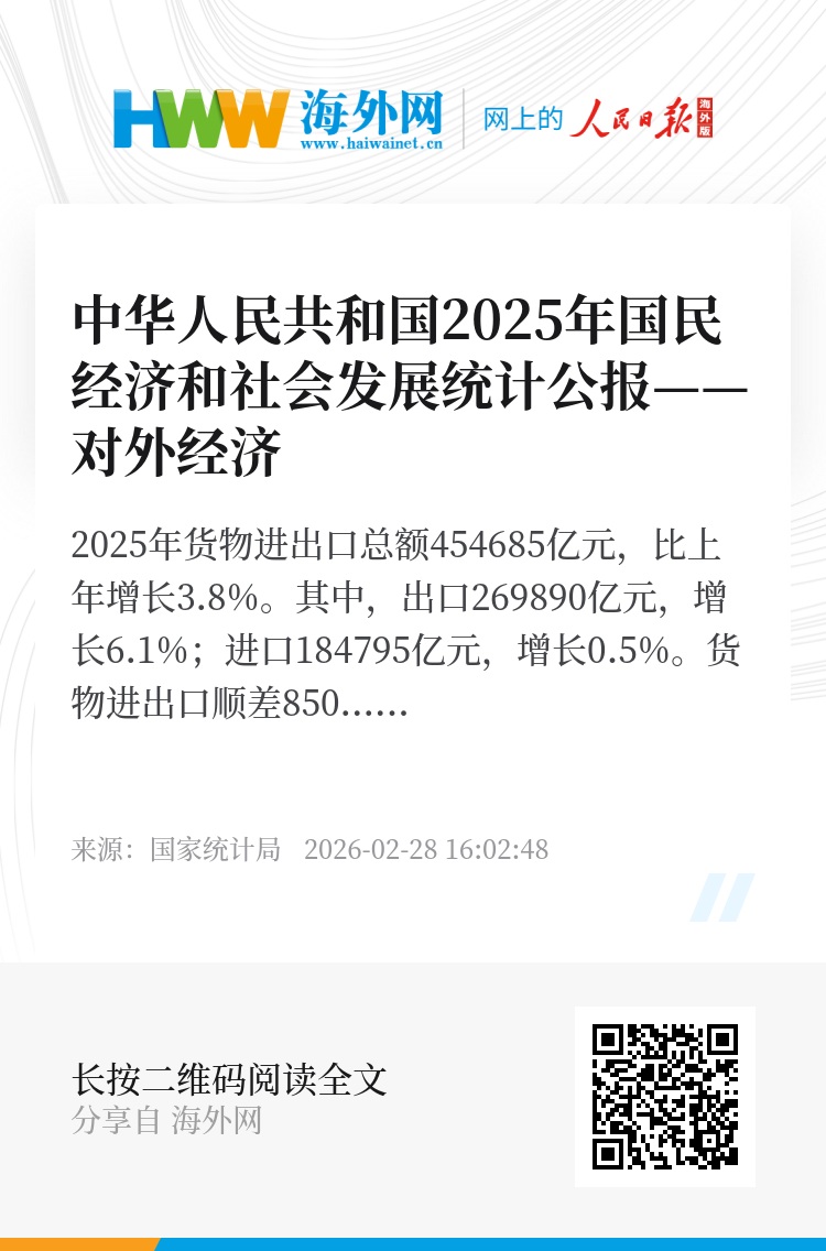 2025年对外非金融类直接投资额10404亿元,比上年增长1.6%。其中,对共建“一带一路”国家非金融类直接投资额2834亿元,增长18.0%。