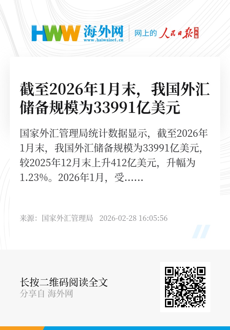 国家外汇管理局统计数据显示,截至2026年1月末,我国外汇储备规模为33991亿美元,较2025年12月末上升412亿美元,升幅为1.23%。