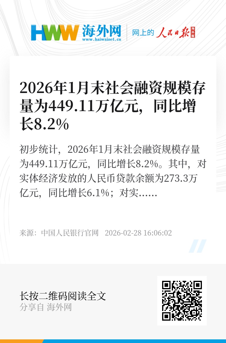 初步统计,2026年1月末社会融资规模存量为449.11万亿元,同比增长8.2%。其中,对实体经济发放的人民币贷款余额为273.3万亿元,同比增长6.1%;对实体经济发放的外币贷款折合人民币余额为1.09万亿元,同比下降12.1%;委托贷款余额为11.3万亿元,同比增长0.2%;信托贷款余额为4.67万亿元,同比增长7%;未贴现的银行承兑汇票余额为2.78万亿元,同比增长6.7%;企业债券余额为34.69万亿元,同比增长6.1%;政府债券余额为95.9万亿元,同比增长17.3%;非金融企业境内股票余额为12.23万亿元,同比增长3.9%。