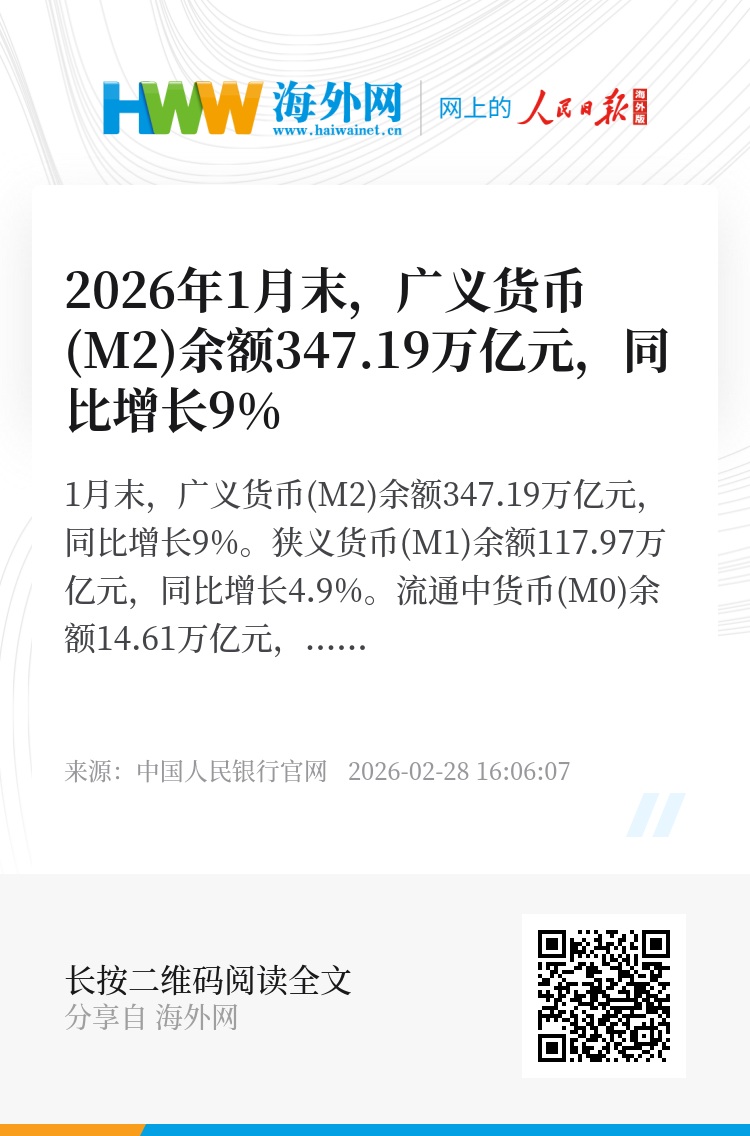 1月末,广义货币(M2)余额347.19万亿元,同比增长9%。狭义货币(M1)余额117.97万亿元,同比增长4.9%。流通中货币(M0)余额14.61万亿元,同比增长2.7%。1月份净投放现金5191亿元。