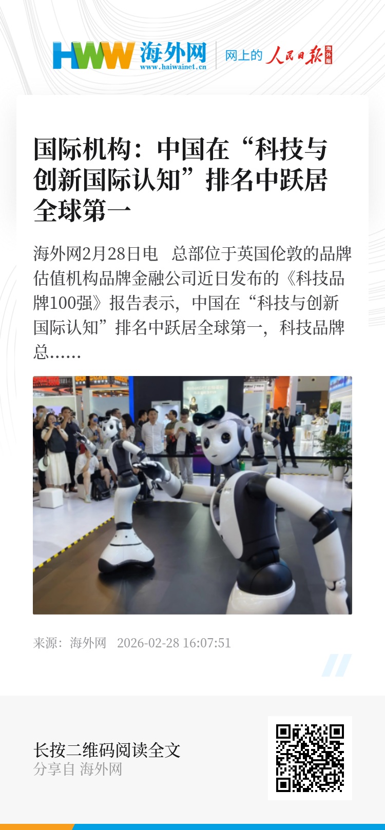 品牌金融公司指出,科技创新是推动一个国家国际影响力、投资吸引力和整体软实力的关键因素。报告引用覆盖全球逾15万名受访者的调查数据显示,2026年中国在“科技与创新国际认知”排名中跃居全球第一。报告认为,这得益于中国在电动汽车、人工智能、可再生能源领域的领先地位,以及大型数字平台在中国的广泛应用。品牌金融公司相关负责人表示,“科技软实力不再纯粹由一个国家的技术品牌规模来定义,而是源于各国如何推动创新落地,使其转化为可靠的技术系统、可感知的商业平台,并最终上升为可信的国家战略。科技实力的未来,将不再取决于谁首先发明,而更多地取决于谁将创新融入全球日常生活。”(海外网 李芳)