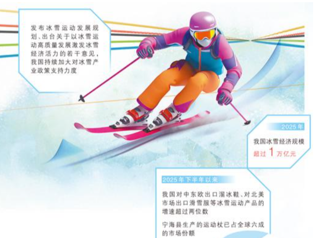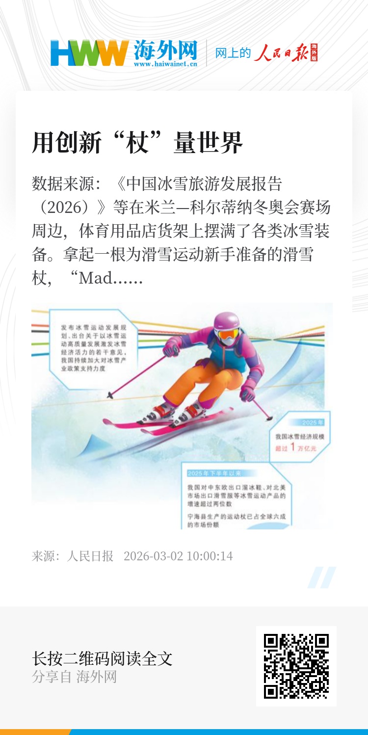 在米兰—科尔蒂纳冬奥会赛场周边,体育用品店货架上摆满了各类冰雪装备。拿起一根为滑雪运动新手准备的滑雪杖,“Made in China”几个英文单词引人注意。这根运动杖的“出生地”是浙江省宁波市宁海县,每年超过1500万根运动杖从这里出发,销往世界各地。