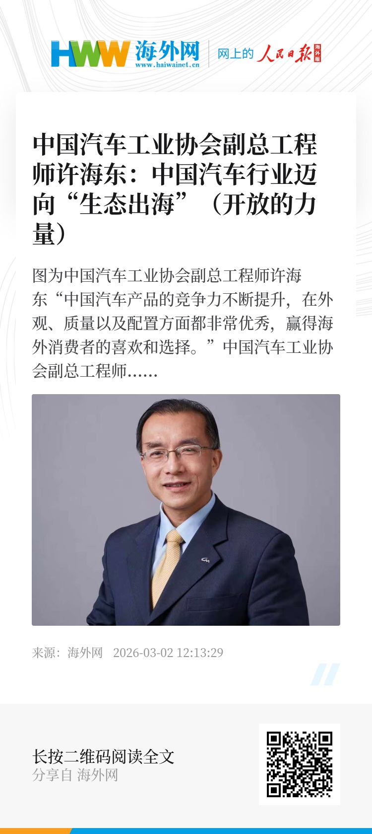 “十五五”规划提出“扩大高水平对外开放,开创合作共赢新局面”。许海东认为,预计“十五五”期间,中国汽车企业将加大海外投资,建设海外工厂,“我们去投资,去建立汽车服务体系,这对当地来说,也会帮助解决就业问题,提供税收。这都是好事,有利于当地发展。”(海外网 李芳)