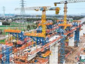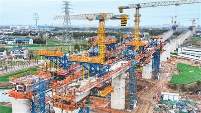通苏嘉甬高铁是长三角城际铁路网的骨干线路,项目实施后将有力补齐区域城际交通南北纵向供给体系短板。图为通苏嘉甬高速铁路(张家港段)建设现场。