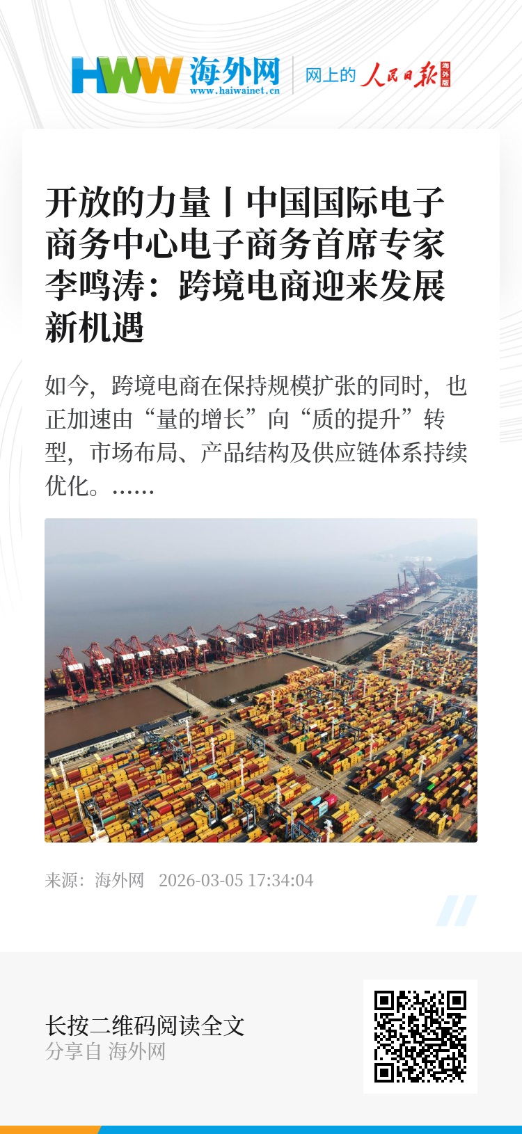 李鸣涛:我国跨境电商已由规模快速扩张阶段,转入高质量发展转型期,增长动力由“量的扩张”转向“质的提升”,行业整体呈现稳中有进、结构持续优化的特征。