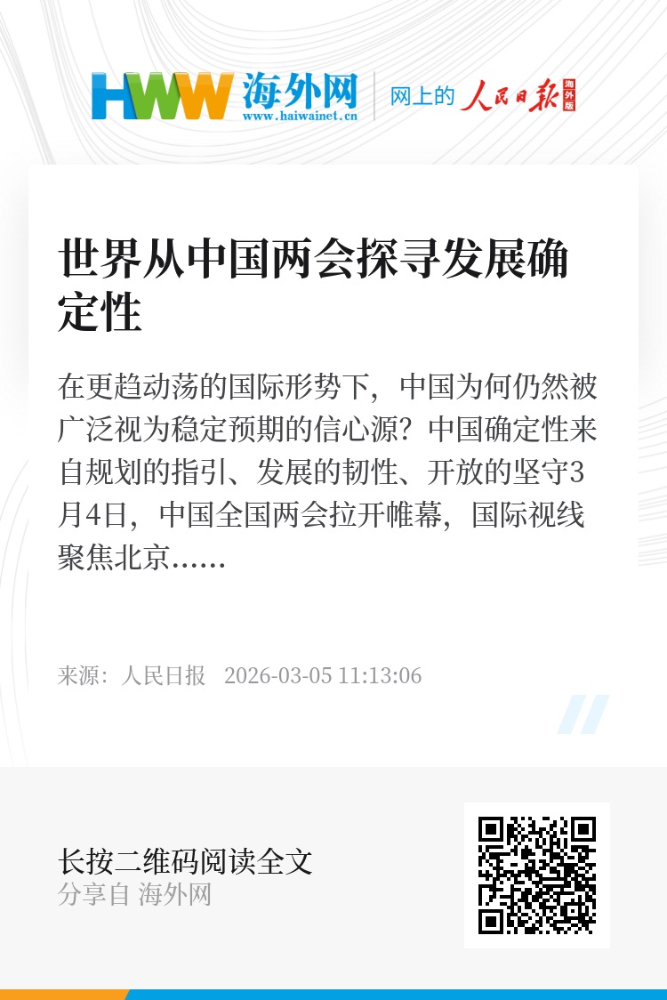 3月4日,中国全国两会拉开帷幕,国际视线聚焦北京。在充满变量的全球坐标中观察中国发展走向,一个判断愈加清晰:面对复杂的国际环境,中国经济向新向优、韧性强劲,中国始终是动荡世界中最稳定、最可靠、最积极的力量。