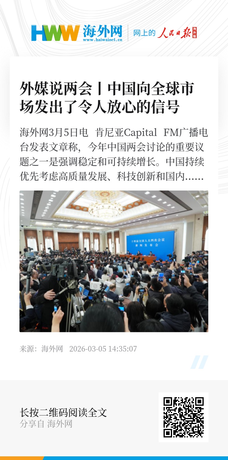 海外网3月5日电 肯尼亚Capital FM广播电台发表文章称,今年中国两会讨论的重要议题之一是强调稳定和可持续增长。中国持续优先考虑高质量发展、科技创新和国内消费,而非追逐数据。这种做法向全球市场发出了令人放心的信号。当全球环境充满不确定性时,中国通过两会明确阐述中国经济路线图,为全球的政府和企业提供了方向感,有助于平息金融动荡。