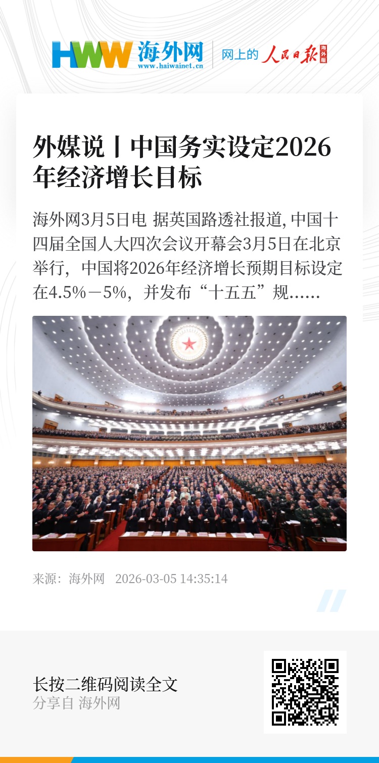 海外网3月5日电 据英国路透社报道,中国十四届全国人大四次会议开幕会3月5日在北京举行,中国将2026年经济增长预期目标设定在4.5%-5%,并发布“十五五”规划纲要草案,强调通过科技创新、大力提振消费推动经济高质量发展。