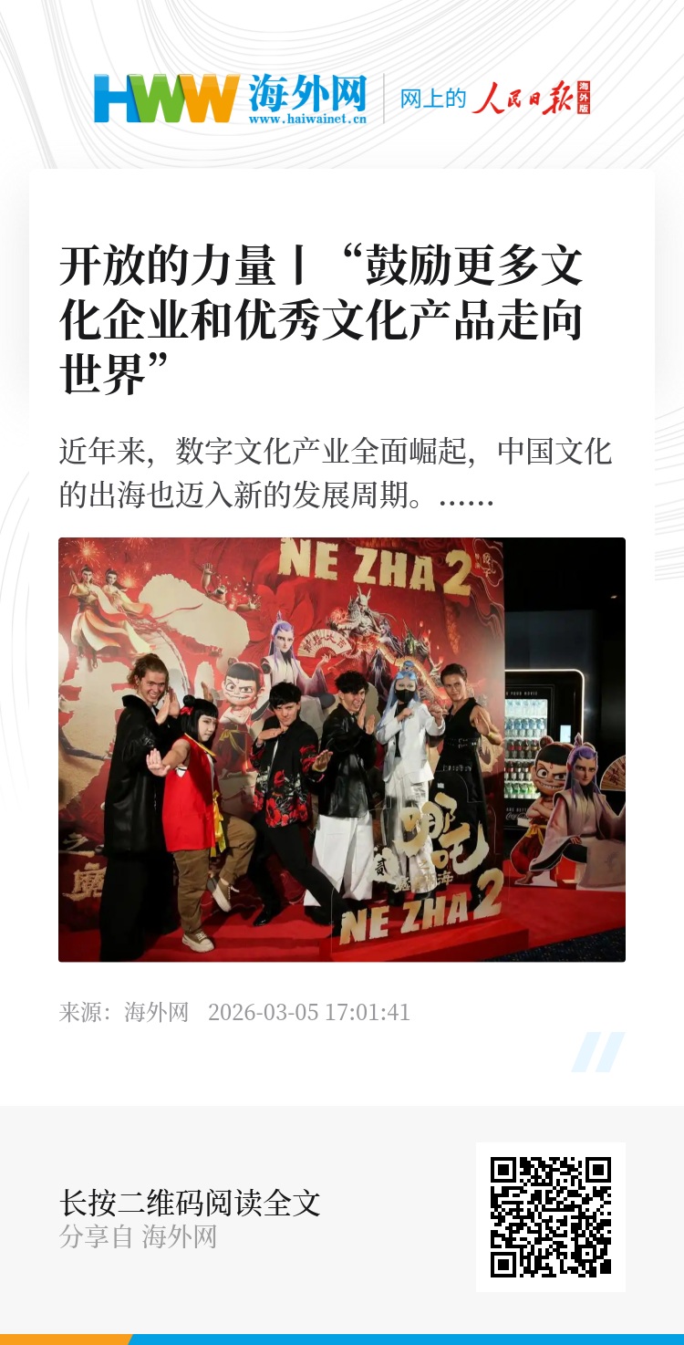 孙佳山:文化出海迈向“深耕”海外市场的关键,是从规模扩张转向品牌化、体系化建设以及全产业链协同发展。首先要从单一产品出口升级为品牌与IP体系出海,强化持续性的影响力。其次是加强核心技术的自主建设,依托现有数字基础设施优势,推动技术与内容的双轮驱动、协同出海。同时,完善市场机制,有效筛选优质内容,推动数字技术与内容生产融合发展,提升传播能力,强化商业化运营,以成熟的产业市场体系和优质的精品佳作,筑牢文化出海的根基。(海外网 穆瑀宸)