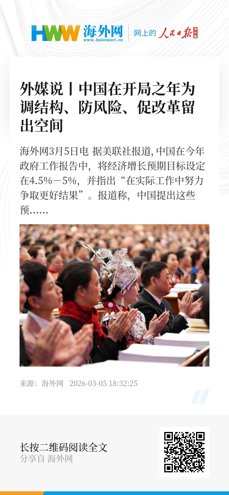 海外网3月5日电 据美联社报道,中国在今年政府工作报告中,将经济增长预期目标设定在4.5%-5%,并指出“在实际工作中努力争取更好结果”。